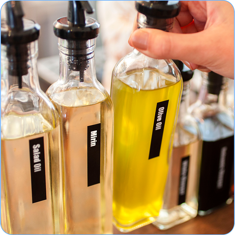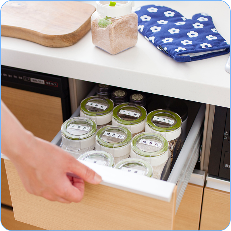 液体类的调味料可以放在上方的橱柜里,干的调味品可以放在下面的橱柜,并放在密封的容器里,并标识好,防止味道走散。