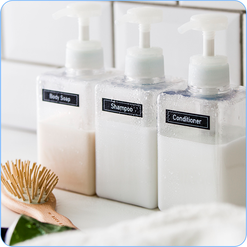 卫浴的物品也是比较多,洗护类的如洗手液、乳液、护发素、沐浴露、身体乳、护手霜等需要统一的标识清楚,在使用的时候就不会用错。